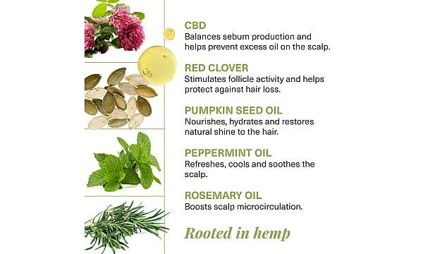 Pumpkin seed oil and hemp seed oil deliver essential minerals and omega fatty acids that nourish the scalp, strengthen the barrier and maintain mosture. They replenish lipids in the hair to restore shine while creating a protective layer that helps shield strands from damage. Peppermint oil delivers an instant cooling sensation that refreshes and relieves the scalp.